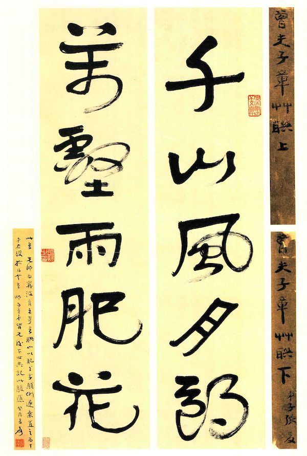 当看到一副名为 “千山风月朗,万壑雨花肥”的对联时,我的内心不仅涌起一丝警觉和欣喜,深有某种似曾相识的感觉。学术敏感使我马上翻来《曾熙书法集》查阅,发现里面的确收录了一副与之极其类似的对联。原来,曾熙应邀为阿育王寺撰联并作书,创作灵感涌现之际,一不小心将其中的两字写颠倒了,成了 “千山风月朗,万壑雨肥花”。尽管这副章草对联从艺术水准上看堪称上乘之作,用笔简练,气息古朴,如“折钗股”“锥画沙”,但本着对作品负责的精神,农髯先生还是将这幅心爱的作品扔进了废纸篓,另书一副。爱徒张君绶看着师傅的神来之笔被弃,非常不舍,偷偷将其捡起收藏,于是有了《曾熙书法集》中的这副笔误之联。无独有偶,张大千对恩师的书法同样追慕和痴迷,他曾见一副被农髯先生丢弃的章草对联,非常喜欢,乃以重金购回。据笔者考察,这种事情在张氏兄弟身上发生过多次。可见,张氏兄弟对恩师艺术的仰慕和痴迷。