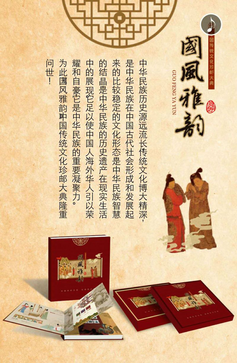 《国风雅韵》收录涵盖中G传世名画、中G古代书法、中G古典文学、中G古代人物、文化艺术、中G戏曲、宗教等中G传统文化题材邮票及小型张34套,共计116枚(小型张5枚)。凸显中G古典文化风雅之趣,展现我中华民族深厚的文化底蕴。邮册设计风格古朴,图文并茂,装帧精美,是集收藏、投资与赠礼于一体的佳品。