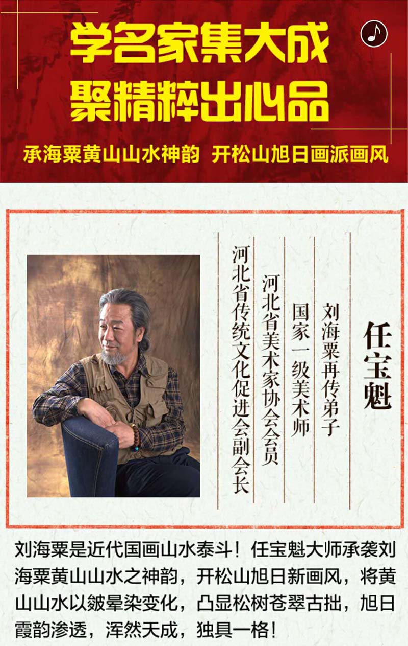 刘海栗是近代国画山水泰斗!任宝魁大师承袭刘海栗黄山山水之神韵,开松山旭日新画风,将黄山山水以晕染变化,凸显松树苍翠古拙旭日霞韵渗透,浑然天成,独具一格!