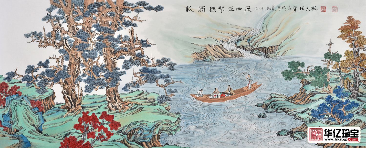 工笔山水画 国画家张天成作品《载酒抚琴泛中流》