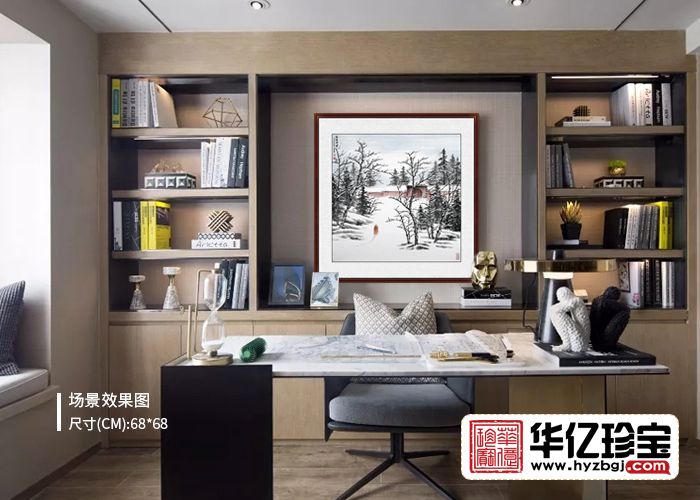 身处喧嚣,心往静禅。山有白雪自不俗,白雪掩映寺观幽。禅画一味有共性,留给观者说缘由。