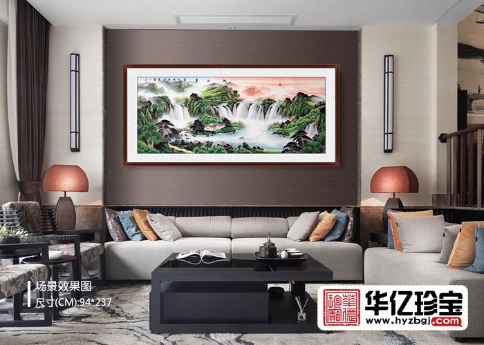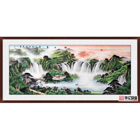 宋唐的这幅《旭日东升》气清山远,风格俊秀,这是一幅聚宝盆山水画。青山绿水蕴含着无限生机,飞瀑源流寓意着财源广进,画中的水寓意着财源丰盛,水库中的石头寓意着池中有宝,帆船寓意着一帆风顺。作品适合于客厅办公室悬挂。给您的居室增添艺术之美同时也让您的居室风水更加和谐顺畅。