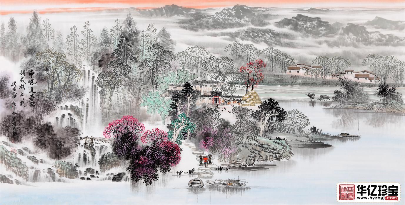 有诗曰:日出江花红胜火,春来江水绿如蓝。能不忆江南?诸明先生的这幅《东风随春归,发我枝上花》山水画是一幅SHI分典型的南派山水画,也就是我们所熟知的江南山水画。顾名思义,江南山水画大多描绘的是江南烟雨,其画风也正好对应了江南山水吴侬细语,香雾缭绕,烟雨朦胧等地域特点。那么诸明先生的这幅江南山水画,透露出一种像是江南美女的温婉与柔情,设色清新典雅,水与墨的相映成辉,层次美的凸显,无不为这幅温婉的江南山水画增色不少。
