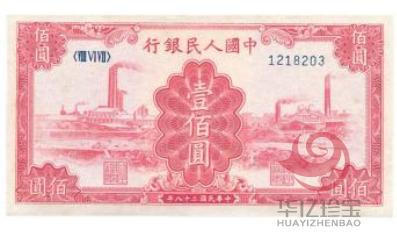 【藏品名称】第一套人民币壹佰圆红色工厂