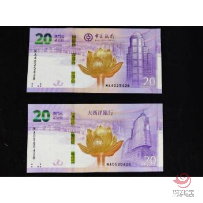 2019年是澳门回归20周年,为庆祝澳门回归祖国20周年,特区政府已经许可中国银行以及大西洋银行,发行庆祝澳门回归20周年纪念钞,面额为20澳门元。
