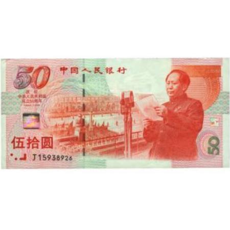 为纪念中华人民共和国成立50周年,中国人民银行于1999年9月份向***各地隆重发行了一款纪念性质的纸币-《建国50周年纪念钞》。该建国纪念钞的正面图案为毛泽东主席在天安门城楼上宣布中华人民共和国成立时的场景。在纪念钞的左面,贴有“天安门”和“50”组合的动态全息图案。在建国纪念钞的左下方还有一组盲人面额标记,以及大小渐变的数字等。而在该纪念钞的背面,其图案则为地球、和平鸽、铜狮和天安门华表等的组合图景。