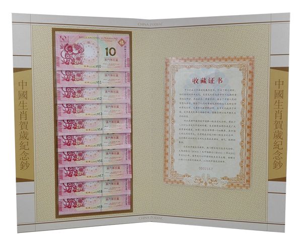澳门特区中G银行(BNU)与大西洋银 行(BOC)联合发行2016丙申猴年贺岁纪念钞,面值10元。以中G传统生肖为主题的新纸币,每年的传统生肖图案分别会印在钞上,为多层次水印防伪、白水 印防伪。