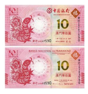 【藏品名称】澳门生肖蛇纪念钞后三同号